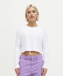 Cropped women’s fit with side seams. Long sleeves with cuffs. Size label only, for easy rebranding – colour-coded white for women. Triblend fabric for style and comfort. Surface excellent for print or embroidery. Ribbed crew neck style, with taped neck. Twin-needle stitching detail on sleeve and bottom hem.
