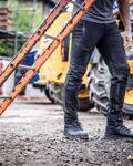 Woven stretch fabric with a durable water repellent finish, Ripstop stretch fabric to knee, seat panels and re-inforcement at the hem, Part elasticated waist and high back waistband, Multi pocketed with front and rear zipped pockets