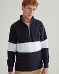 Retro fit fashion 1/4 zip, Heavyweight single ejersey fabric, Cut and sew contrast panel around centre, Self fabric funnel neck and silver metal zipper and zip pull, Herringbone back neck tape and contrast herringbone taped side vents and shoulders, Stepped hem, Elastane reinforced ribbed cuffs for shape retention, Twin needle hem, Topstitching at armholes and panels